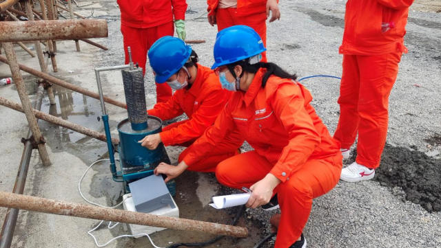 碾压工艺试验进行时,各参建单位通力配合,精诚协作。施工单位项目部总体组织并实施碾压工艺试验顺利实施;试验检测单位现场取样测取并验证出机口及入仓后混凝土的VC值、含气量等中间产品试验参数,确定最优的投料顺序及拌和时间;温控科研单位采用多种数字式温度计测取碾压混凝土出机口温度、入仓温度、浇筑温度进行跟踪测量记录,获取混凝土热学相关参数,为后期大坝碾压混凝土正式浇筑温度控制、建模计算提供基础试验数据;业主、咨询、设计、监理单位就各自职责分工对现场碾压混凝土试验进行相关指导、交流。